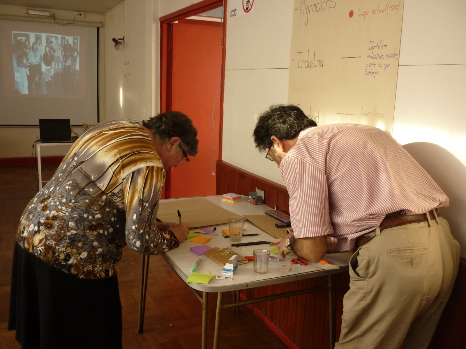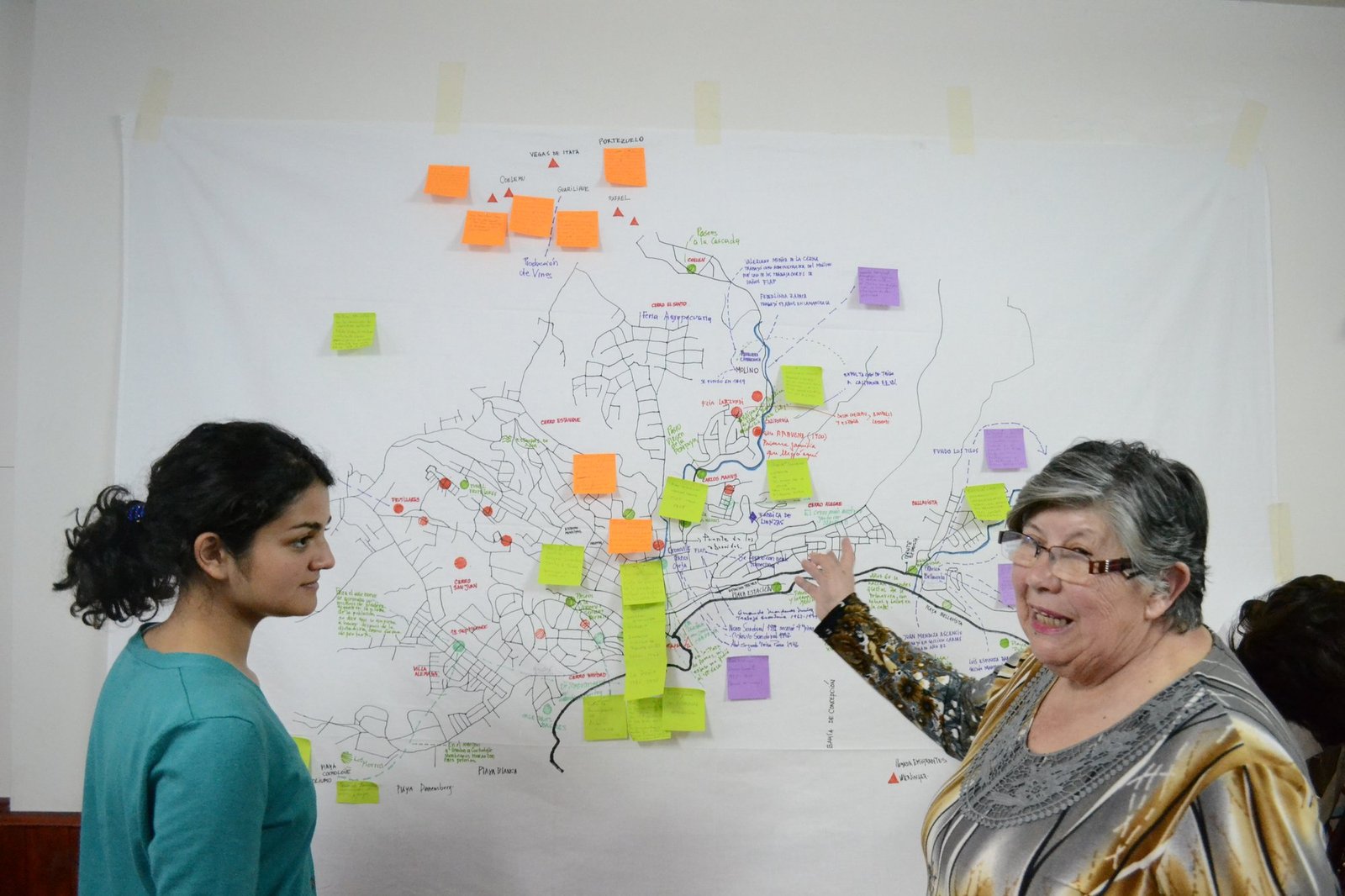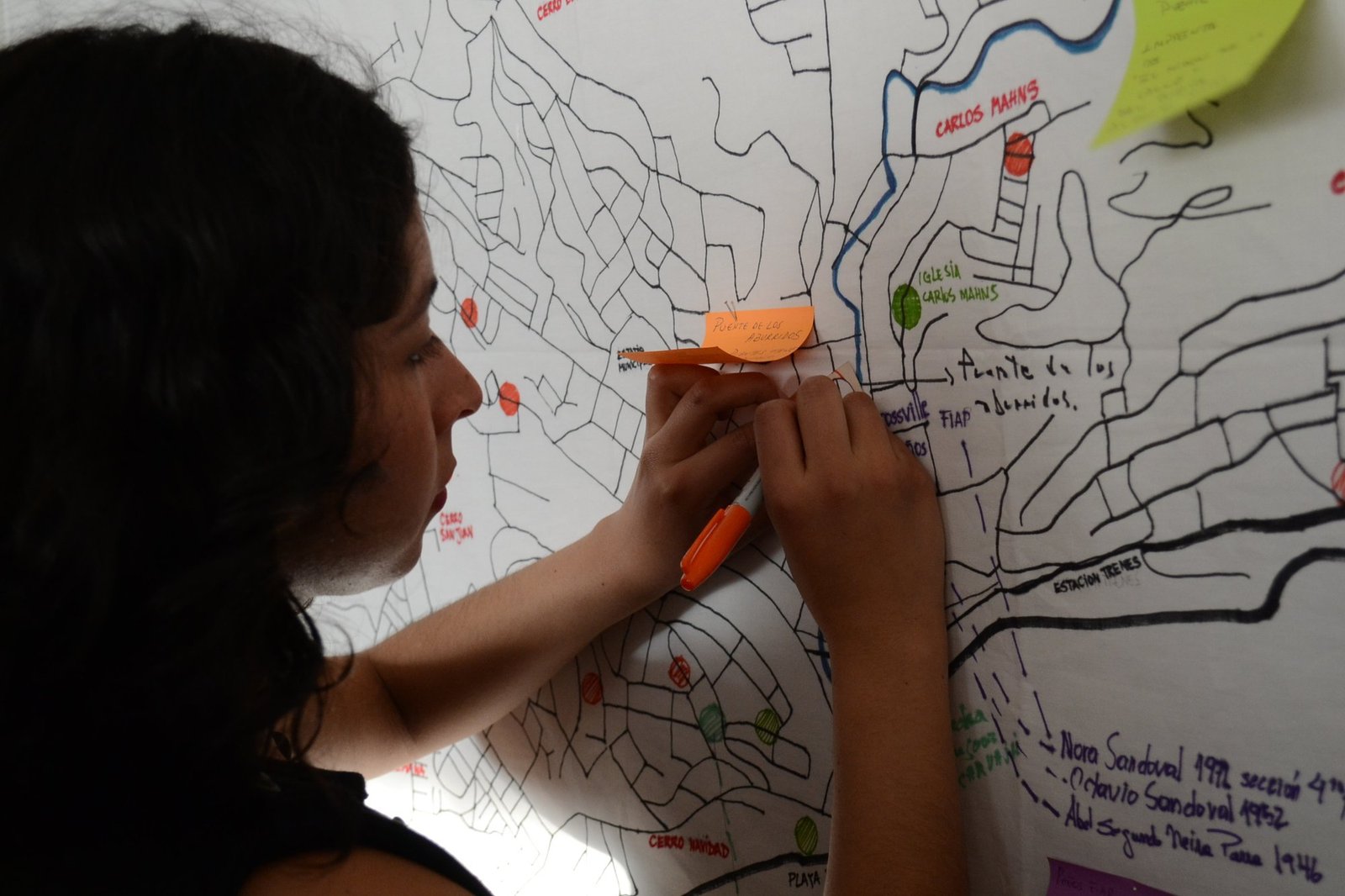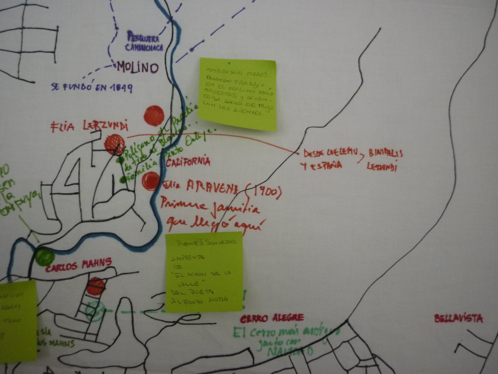 Esta actividad fue diseñada como una experiencia de intercambio con la comunidad de Tomé, a propósito del lanzamiento del segundo número de El Residente. Junto a la presentación de la publicación, se invitó al público asistente a participar de un mapeo colectivo que abordaría la memoria individual y colectiva en conexión con la historia textil de la ciudad. El ejercicio, realizado con la colaboración de CECUM (Centro de Educación y Cultura Mistral), planteaba tres ejes de trabajo: migración, industria y ciudad. Se dispuso un gran mapa de Tomé sobre uno de los muros del espacio, en el que las personas cartografiaron momentos, lugares e historias personales a partir de los ejes planteados. Para esta iniciativa contamos con el apoyo de Úrsula Cea en el desarrollo metodológico y de Tatiana Binimelis en los registros.
