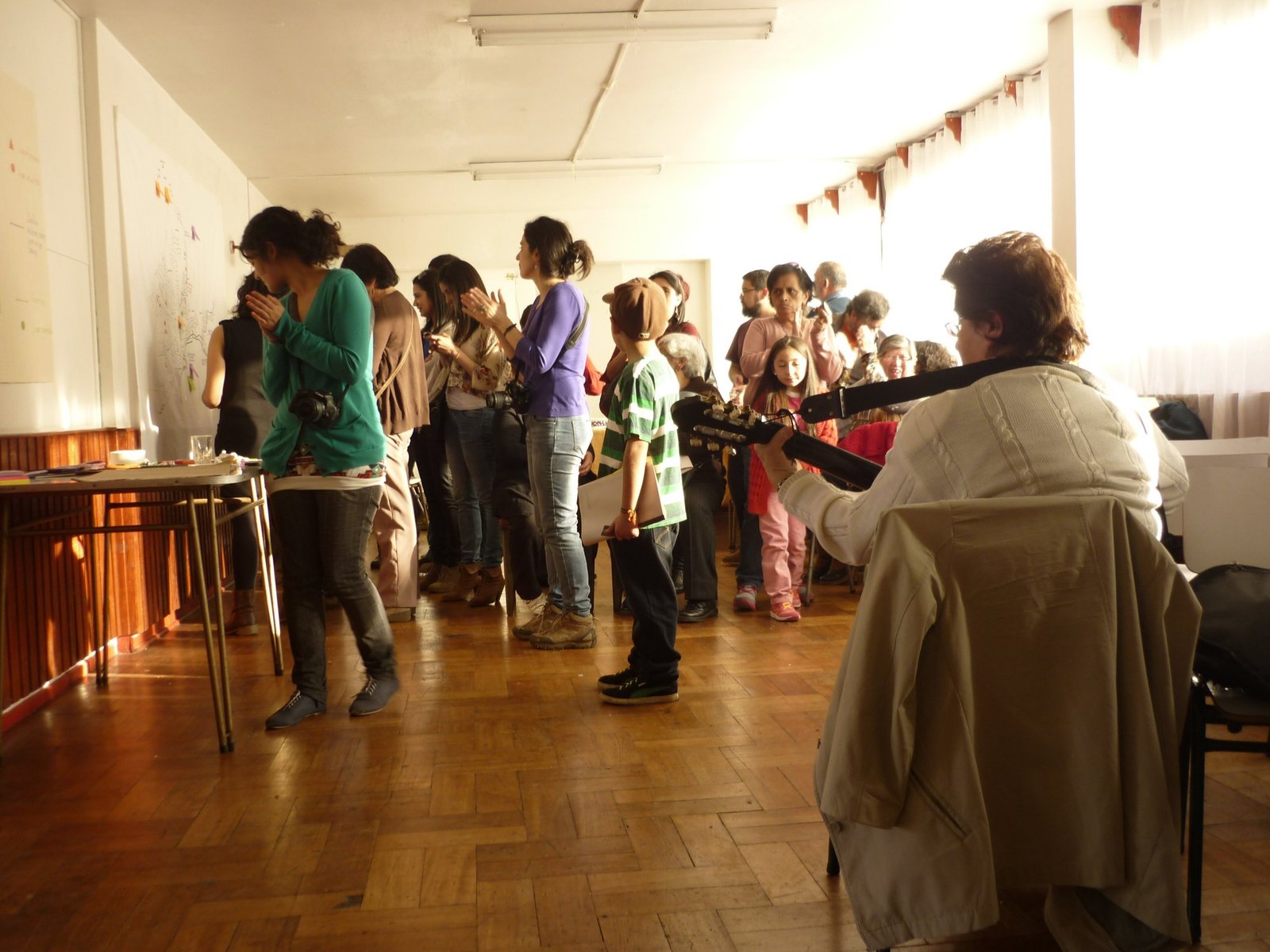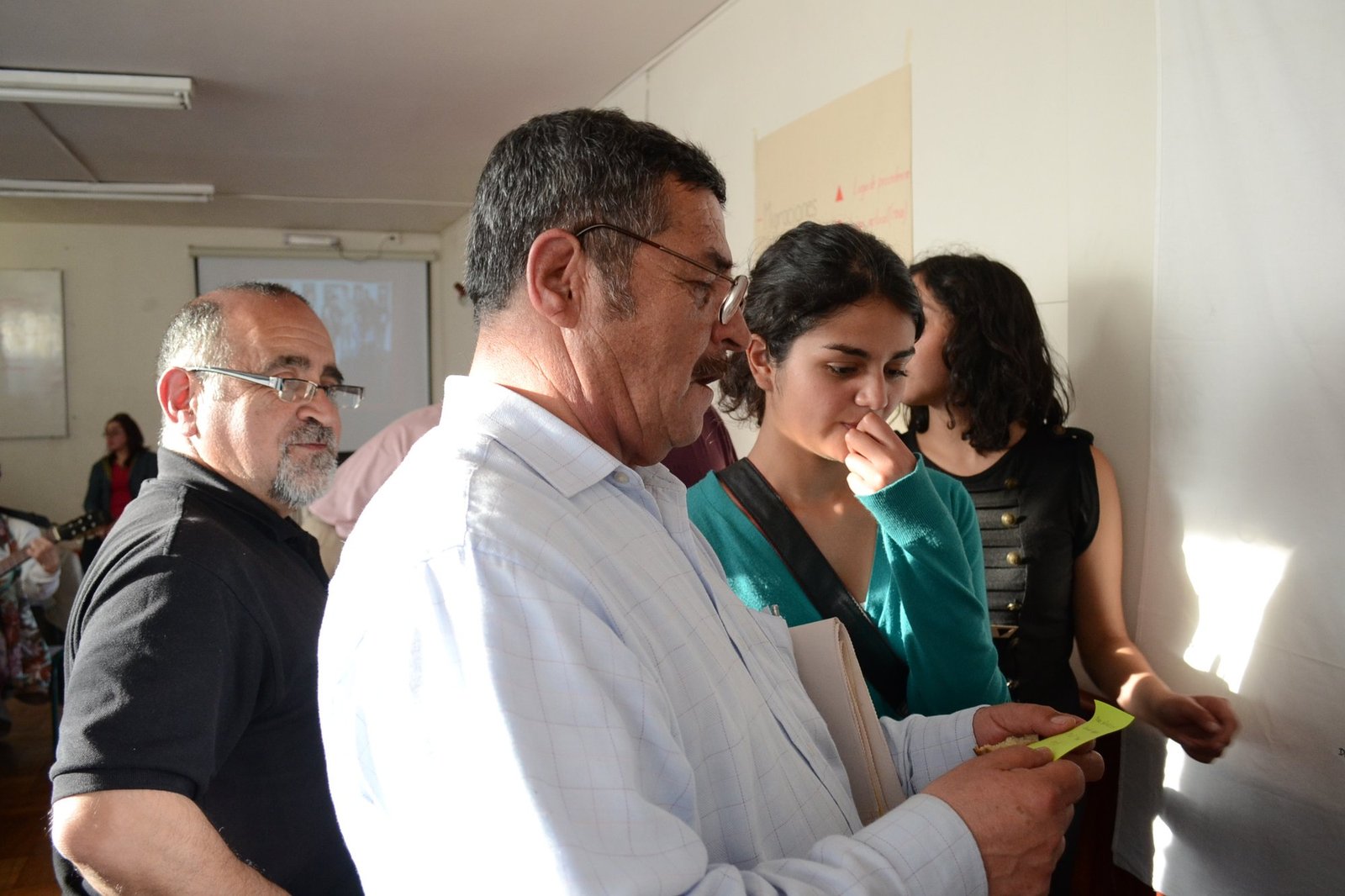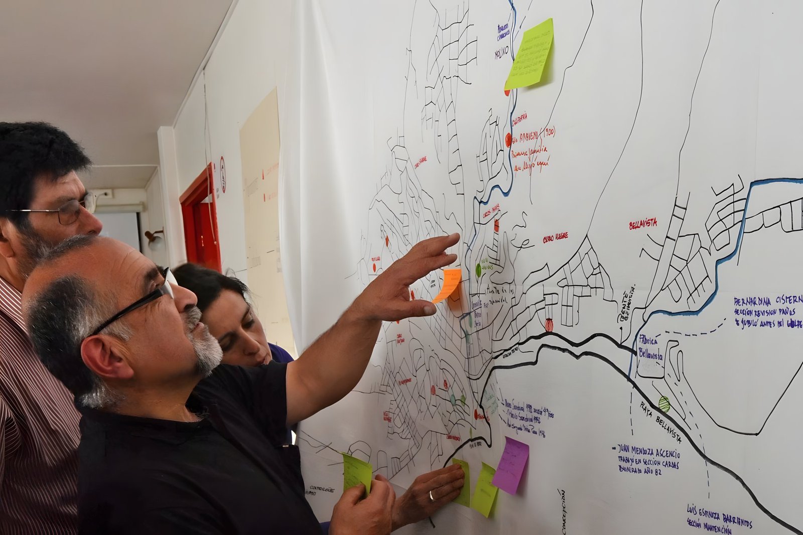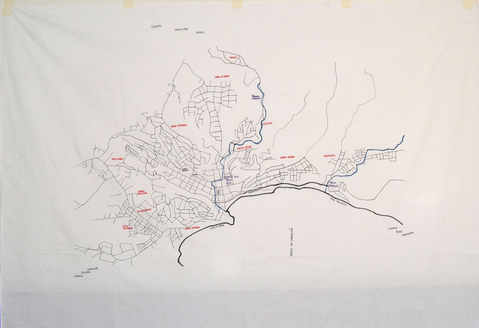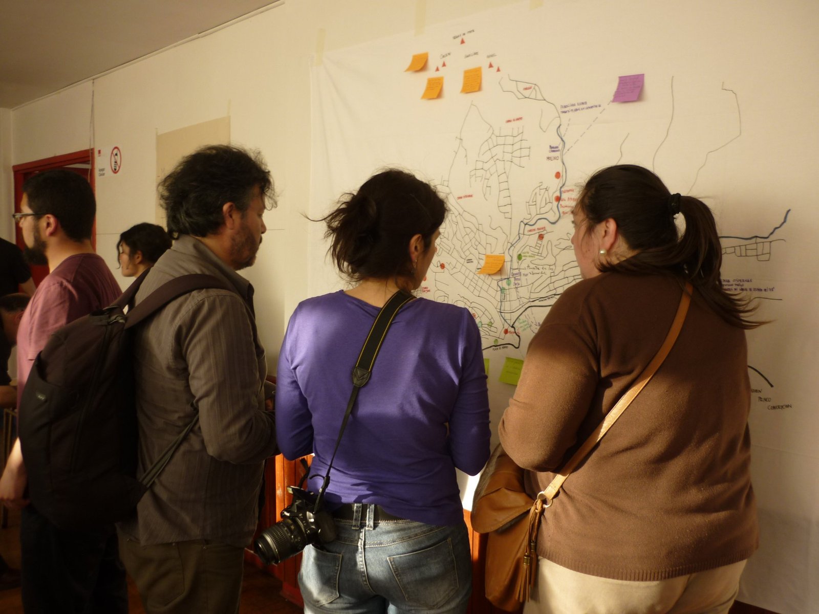 Esta actividad fue diseñada como una experiencia de intercambio con la comunidad de Tomé, a propósito del lanzamiento del segundo número de El Residente. Junto a la presentación de la publicación, se invitó al público asistente a participar de un mapeo colectivo que abordaría la memoria individual y colectiva en conexión con la historia textil de la ciudad. El ejercicio, realizado con la colaboración de CECUM (Centro de Educación y Cultura Mistral), planteaba tres ejes de trabajo: migración, industria y ciudad. Se dispuso un gran mapa de Tomé sobre uno de los muros del espacio, en el que las personas cartografiaron momentos, lugares e historias personales a partir de los ejes planteados. Para esta iniciativa contamos con el apoyo de Úrsula Cea en el desarrollo metodológico y de Tatiana Binimelis en los registros.