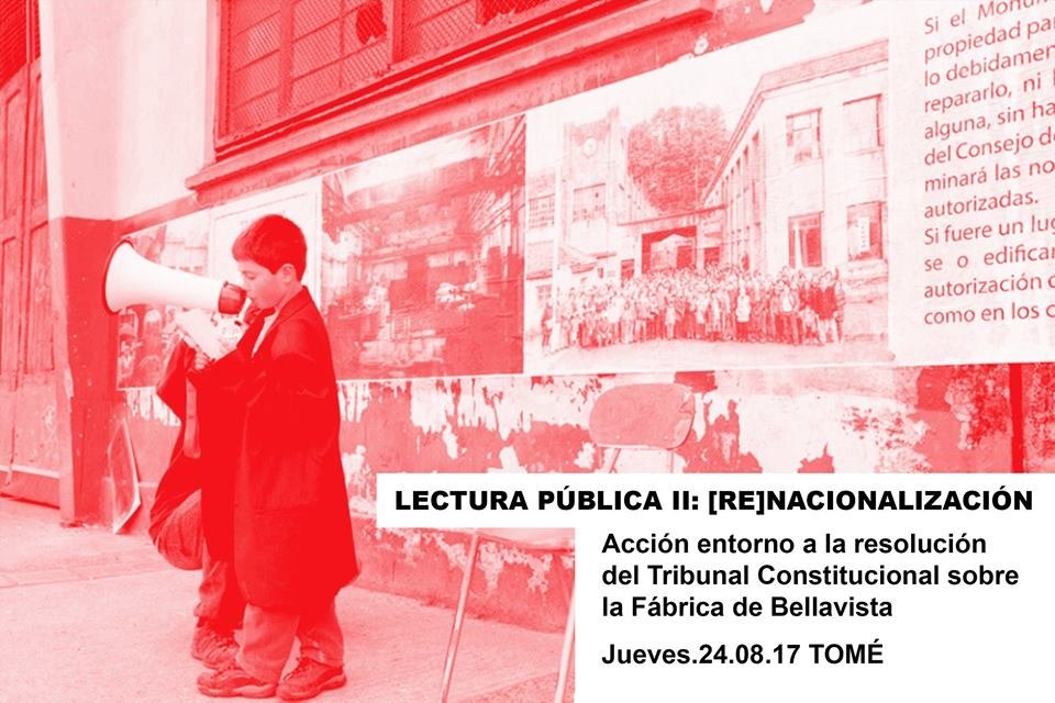 Habiendo desarrollado una serie de iniciativas en torno a la historia textil de Tomé desde el año 2010, el proyecto [RE]NACIONALIZACIÓN, en sus diferentes etapas, fue un trabajo que buscó visibilizar las tensiones que emergieron producto de la lucha ciudadana por el patrimonio industrial de la ciudad. Un hecho fundamental fue la creación de la Mesa Ciudadana por el Patrimonio de Tomé y su batalla para que las autoridades autorizaran la declaración de la Fábrica Bellavista Oveja Tomé como monumento nacional. El proyecto [RE]NACIONALIZACIÓN se enmarca dentro de un proceso de investigación de largo aliento, que exploró el concepto de patrimonio como una esfera de reivindicación popular conectada con otras comunidades en resistencia frente al desmantelamiento de la producción industrial en la región.