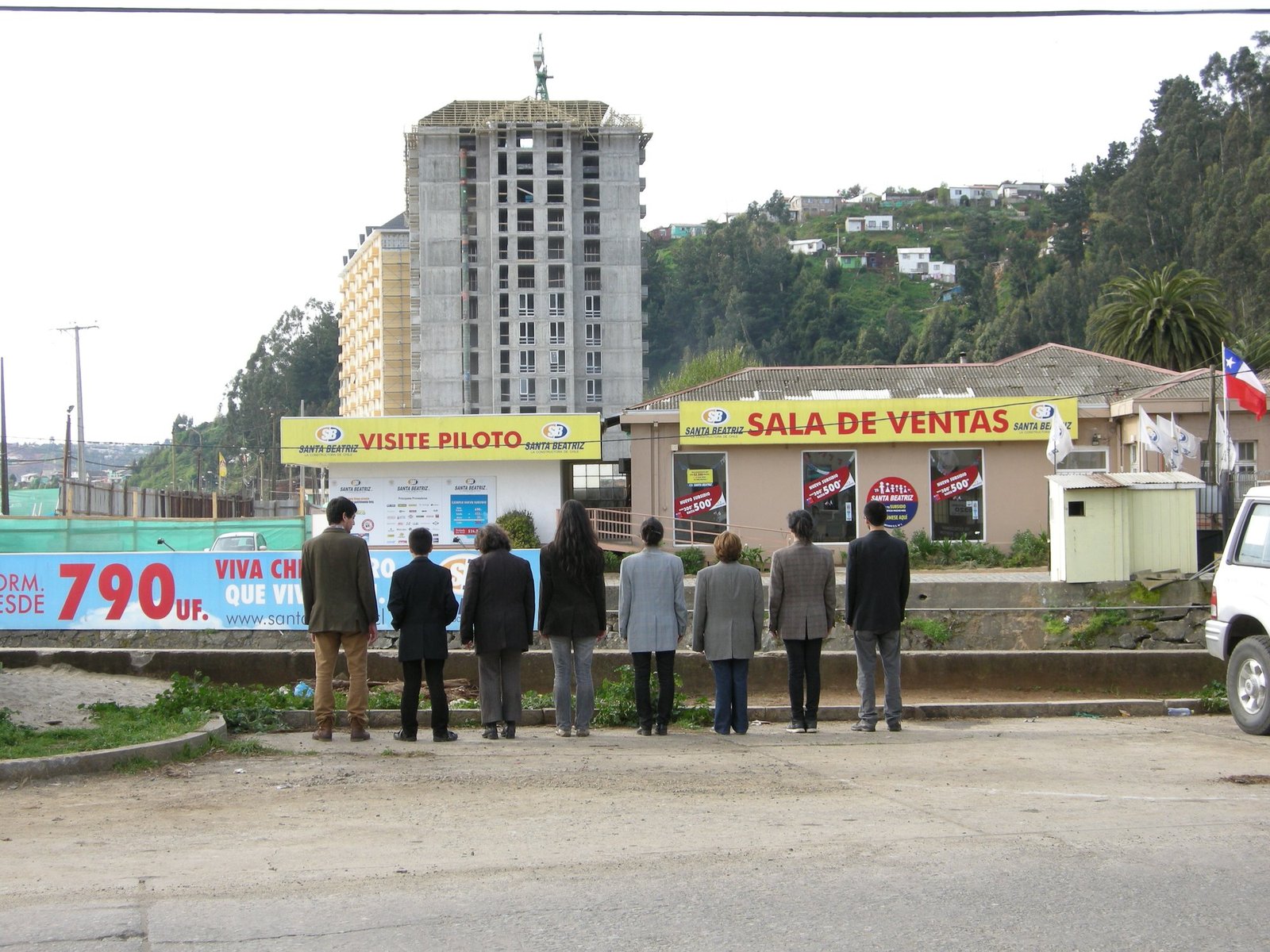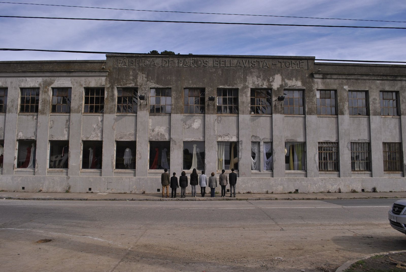 Esta acción fue realizada para el segundo número de El Residente, publicación que se originó a partir del programa de residencias gestionado por Mesa8. Dicho ejemplar proponía una reflexión sobre las vicisitudes de la historia textil de Tomé, la persistencia de la memoria obrera y los intentos por conservar el patrimonio industrial de la ciudad. Vestidos para la Acción consistió en un recorrido por sitios emblemáticos de la memoria textil de Tomé, disponiendo los cuerpos del colectivo de frente y espalda ante la fachada de las antiguas fábricas textiles, señalando también el proceso de gentrificación inmobiliaria que se desplegaba en ese momento. Los/as participantes vestían ternos hechos con telas producidas en las fábricas textiles de Tomé, y la acción se llevó a cabo por integrantes de Mesa8 y amigas del Centro de Educación y Cultura Mistral de Tomé, CECUM.